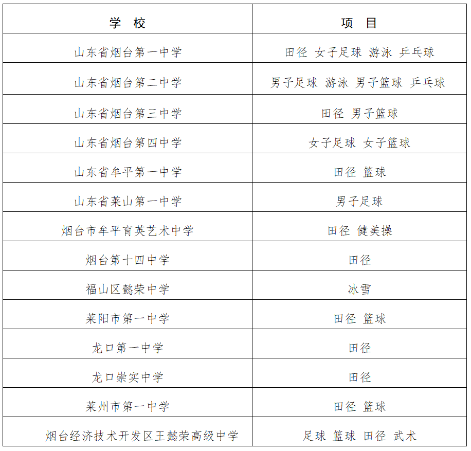 烟台二中、烟台三中、莱山一中、牟平一中、牟平育英艺术中学、福山一中、海阳一中、蓬莱一中、龙口一中、招远一中、开发区高级中学