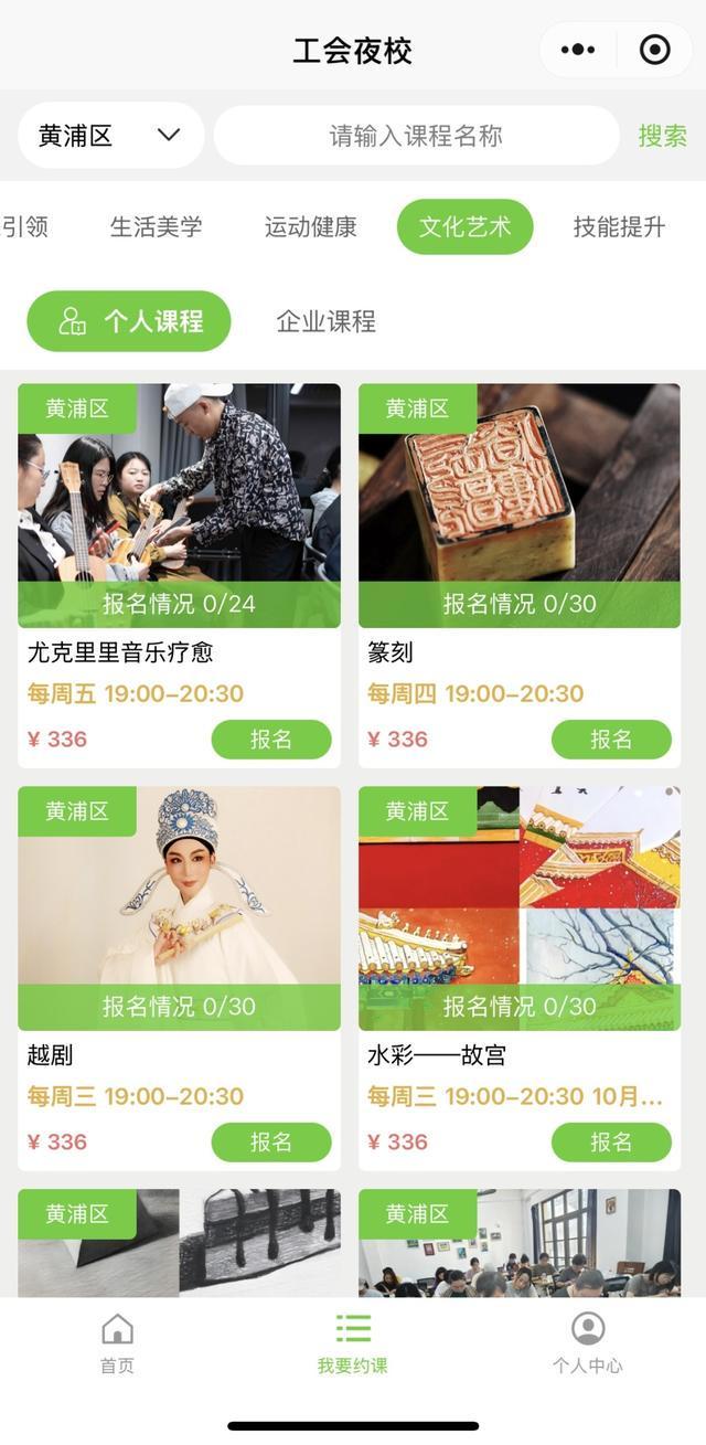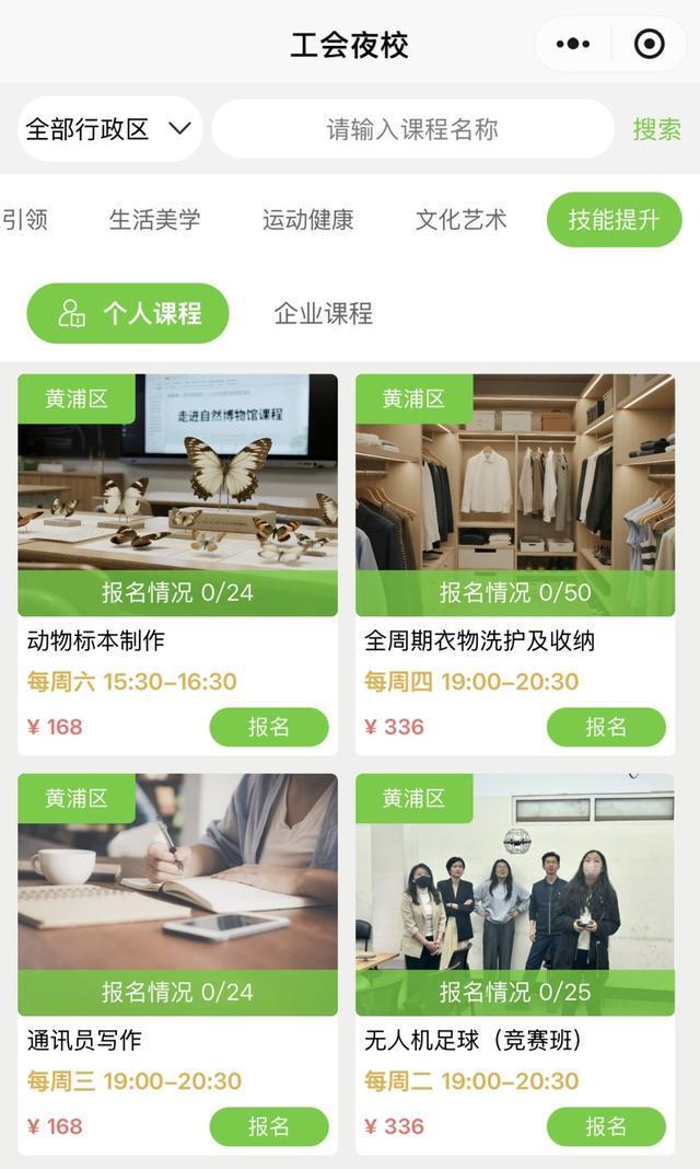 记者检索“工会夜校”微信小程序,个人课程中,“技能提升”课程包括无人机足球、AI办公、通讯员写作、整理收纳、中式面点手作、海派川菜探究、电工木工等;“生活美学”课程有建筑速写、马克笔手绘、创意手工、茶文化,以及宋锦、掐丝珐琅技艺等非遗文化;“运动健康”课程有瑜伽、八段锦、搏击操、尊巴等;“文化艺术”课程有主持朗诵、魔术表演、越剧、声乐、拉丁舞等。