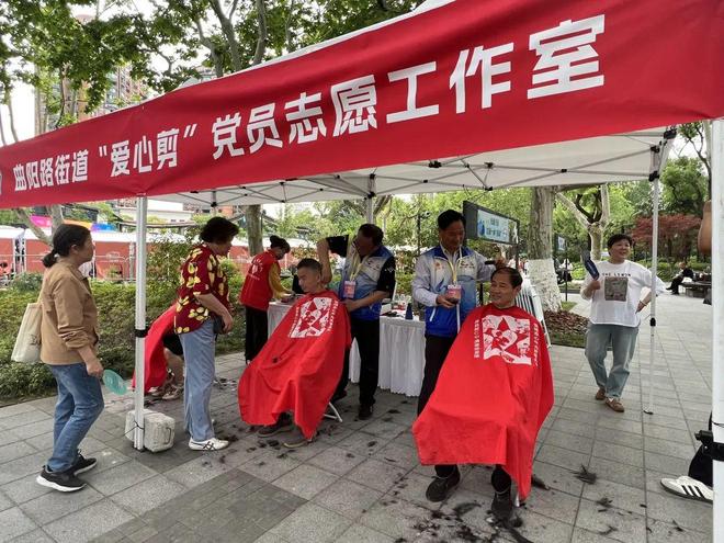 曲阳路街道“爱心剪”党员志愿工作室领衔人殷仁俊,也在活动现场义务为市民群众服务。37年来带领工作室成员步履不停,提供20多万小时的理发时长,80多万次的服务记录,曾荣获“中国好人”“全国最美志愿者”“社会主义精神文明好人好事”等荣誉称号,为社区老人、好八连提供免费的理发服务。