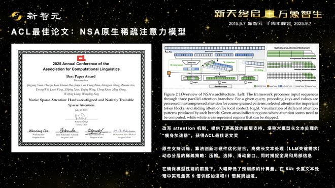 2025年,团队与DeepSeek合作提出的NSA模型,在长文本处理上实现了最高11倍加速,最终斩获ACL2025最佳论文。