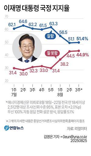 Realmeter于8月18日至22日对全国2512名18岁以上的合格选民进行了调查,结果显示,51.4%的受访者对李总统的政绩评价为“良好”,较7月下降了10个百分点左右。韩联社