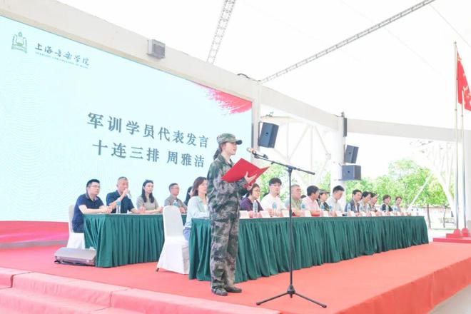 十连三排数字媒体艺术学院周雅洁作为军训学员代表发言,她相信在军训中淬炼出的坚毅品格与顽强意志,必将为今后的专业学习注入持久动力;她将始终心怀为校争光、为国添彩的使命感,努力成长为上音的骄傲,不负时代,不负韶华。